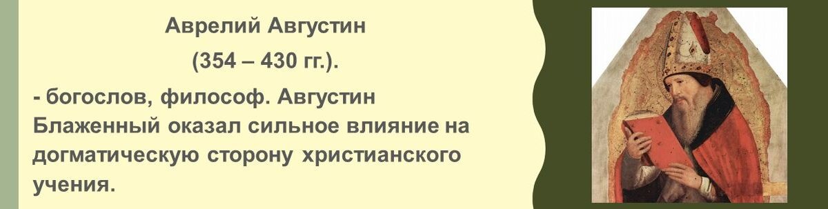 Августин Блаженный, середина V века, один из первых идеологов христианства, кардинал - Человек подобие бога. Сущность идеологии сводилась в основе к религиозному христианскому спиритуализму в образе Града Божьего в учении Августина Блаженного, к отрицанию ценности всего земного, материального по сравнению с духовным, ибо в мировоззрении произошел разрыв между тем и другим. Есть Град Божий и град земной, нужно жить градом Божьим, отрицая град земной - частную собственность (многие дворяне уходили в монастыри, отписывая им свои поместья), богатства, власть, славу (художники не подписывали свои работы - не прославляли свои имена).